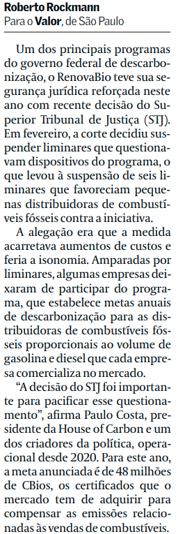 O jornal Valor Econômico destaca nesta quinta-feira, 09 de abril, reportagem de Roberto Rockmann sobre decisão do STJ relacionada ao programa de Estado RenovaBio.