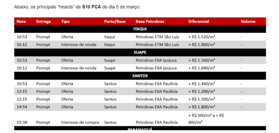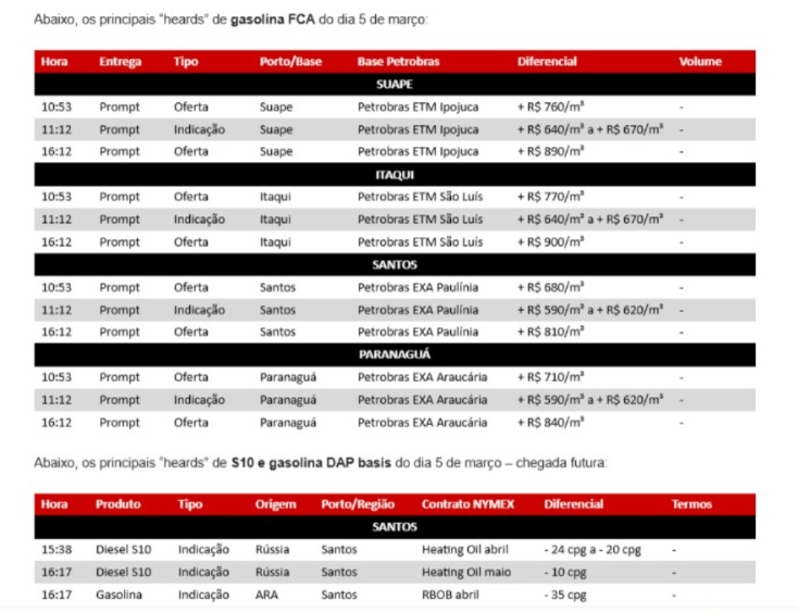 informações fornecidas pela agência Platts, parte da S&P Global Commodity Insights, com notícias relevantes sobre o setor.Agência Platts – dados de 05 de Março